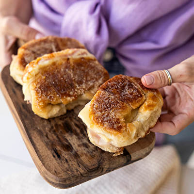 Para una mañana de sábado, una clásica de siempre pero con un toque que lo cambia todo. MEDIALUNAS DE JAMÓN Y QUESO CON COSTRITA DE AZÚCAR Y LIMÓN: