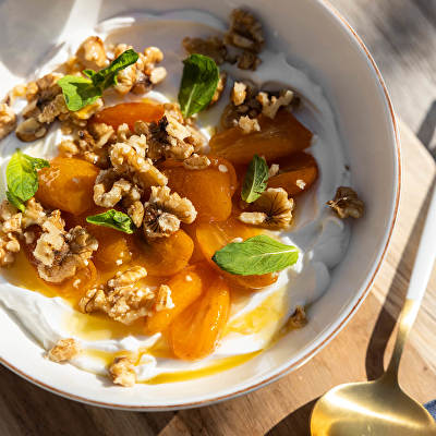 150 g de quinotos1 cdta de azúcar1 cdta de mielJugo de ½ naranjaPuñado de nuecesSal marina (cantidad necesaria)Chorrito de aceite de olivaYogur griegoHojas de menta (cantidad necesaria)